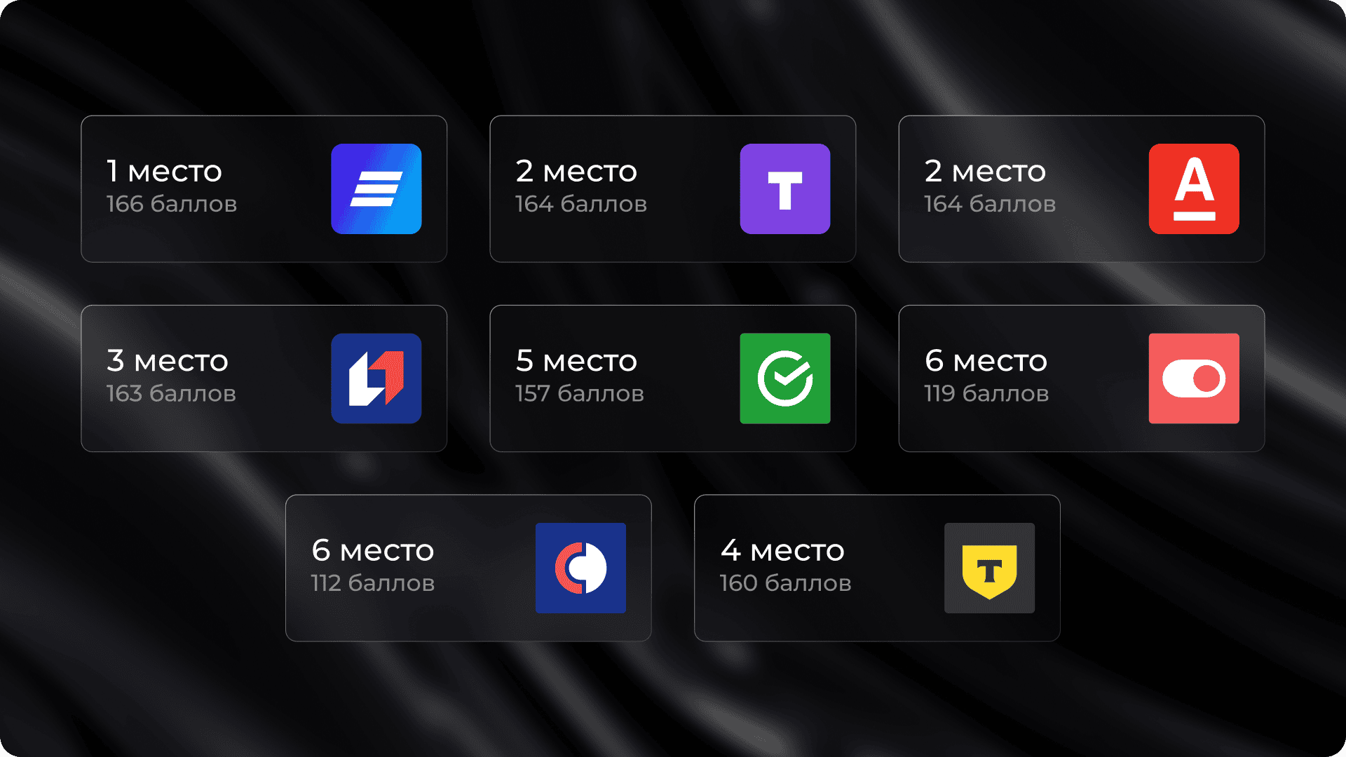 Альфа-Банк и Точка разделили второе место. Альфа-Банк отличился интуитивным интерфейсом, который позволяет выполнять дейли сценарии быстрее и эффективнее. Точка подтвердил статус современного банка с уникальным дружелюбным стилем коммуникации.