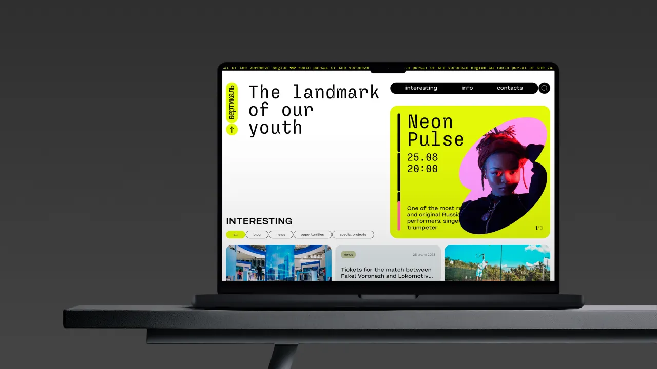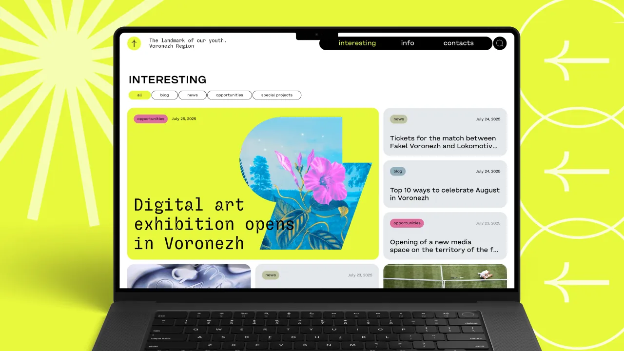 Сделали под ключ яркий портал для Управления молодёжной политики Воронежской области. Там активная молодёжь может найти актуальные мероприятия, принять участие в конкурсах и фестивалях и узнать новое о городе и его жизни. На первый взгляд и не скажешь, что это официальный проект.