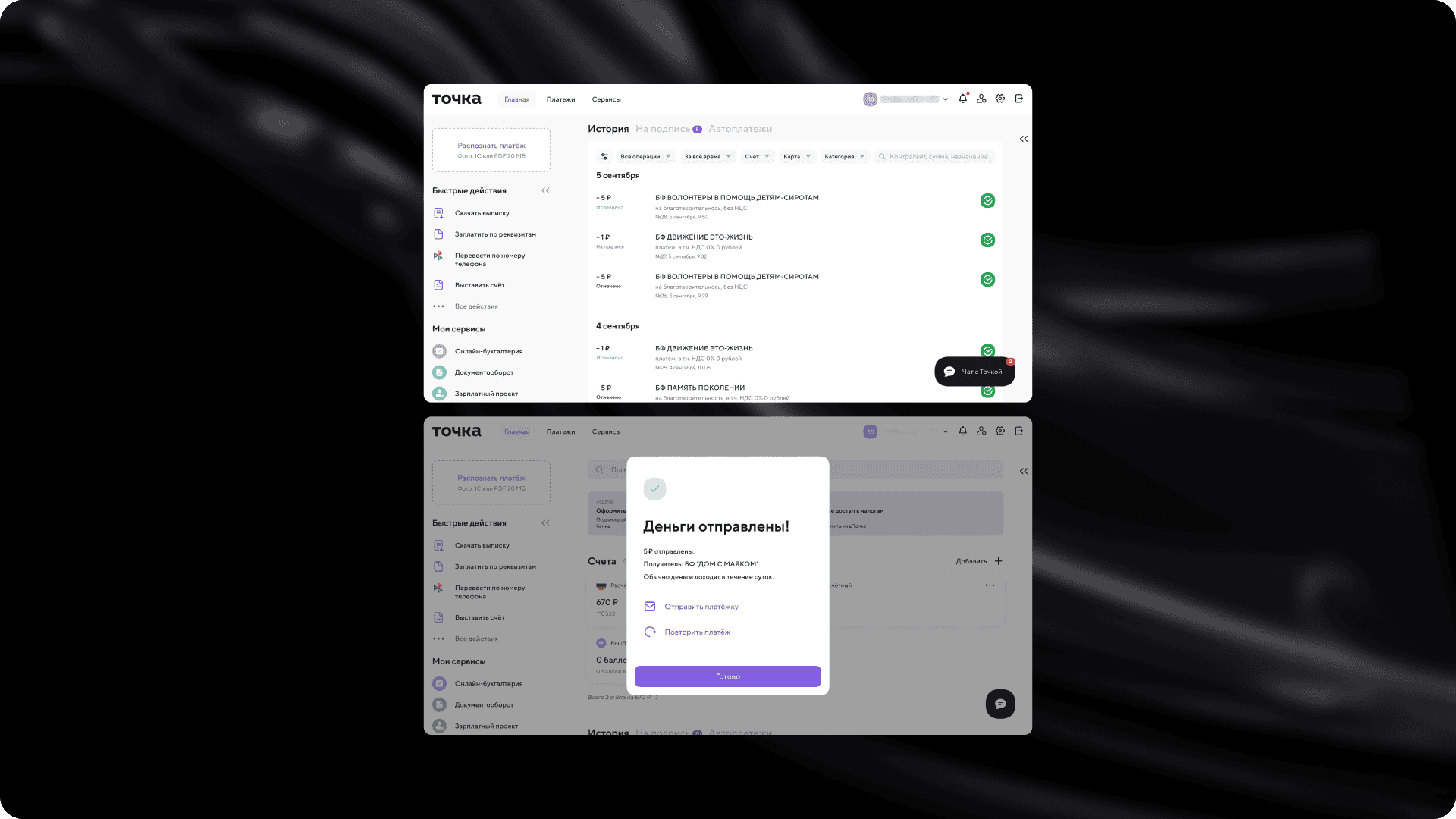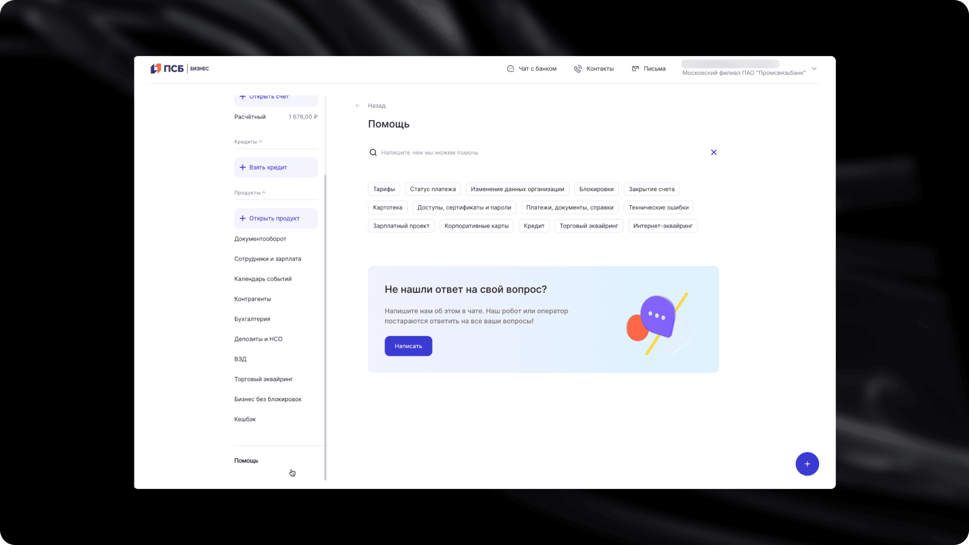 Современный банк для МСБ с интуитивным интерфейсом, не требующим дополнительного обучения. Коммуникация с пользователем отличается уникальным и дружелюбным тоном. Создаётся ощущение лёгкой доступности всех сценариев.