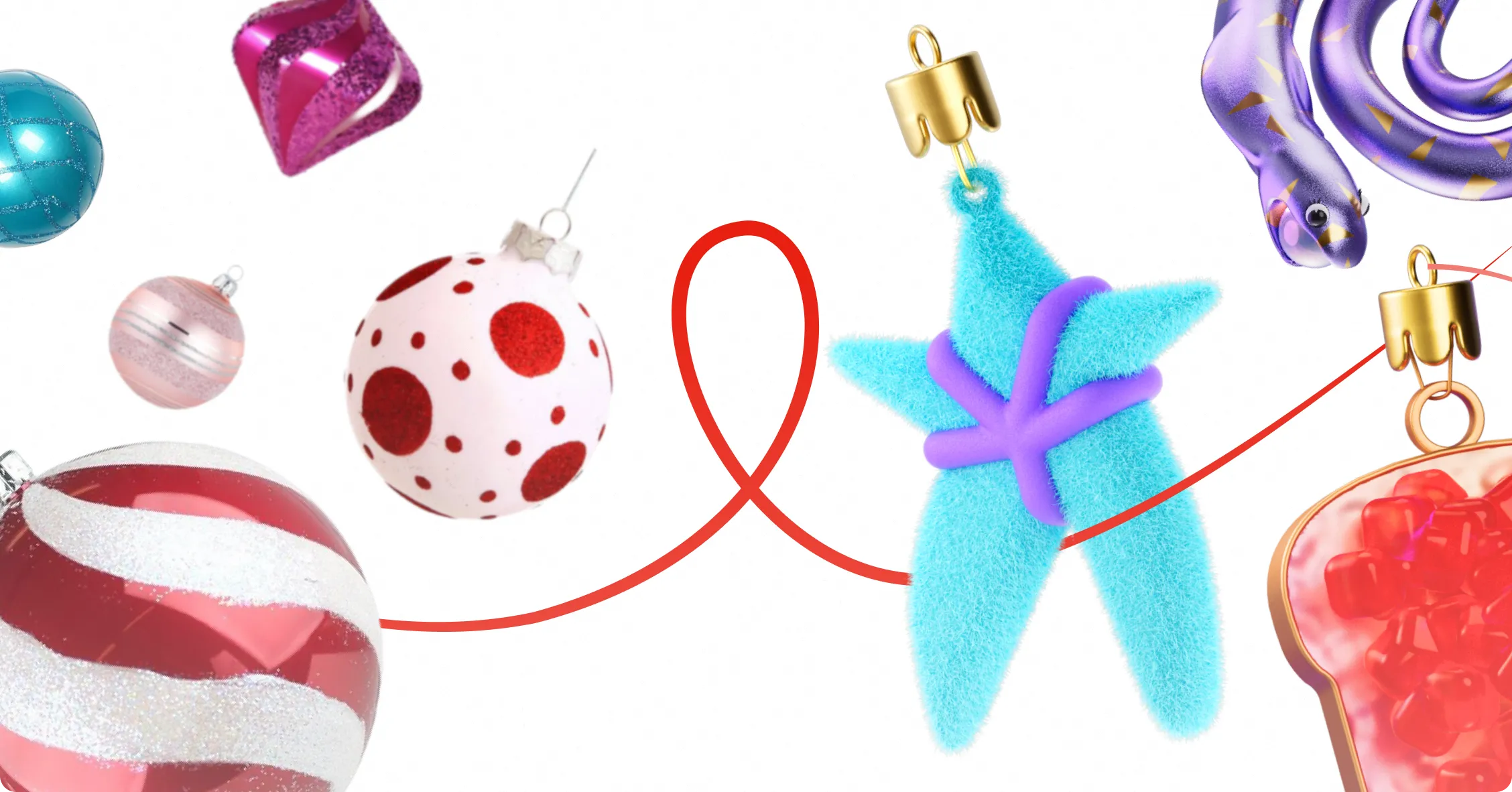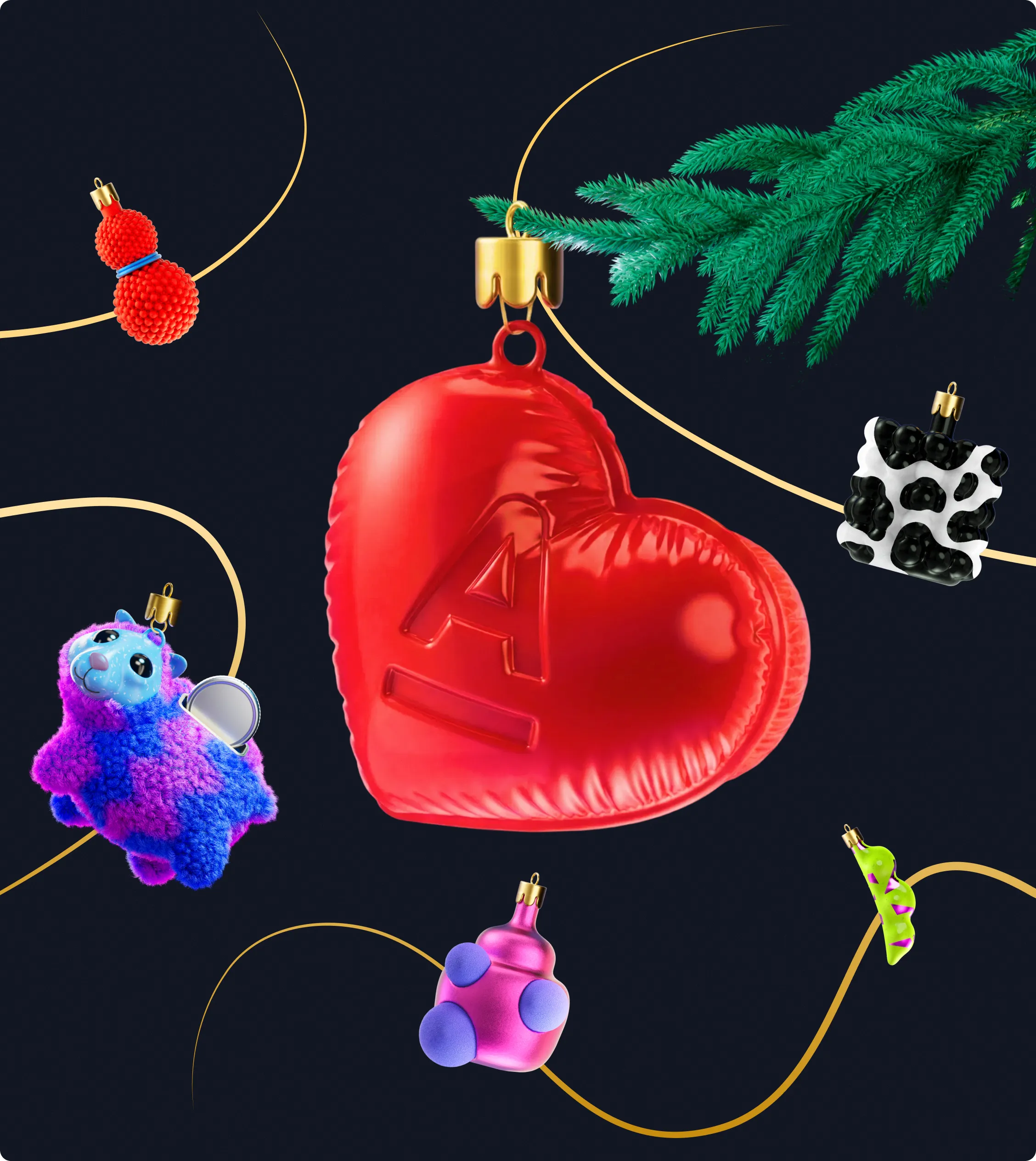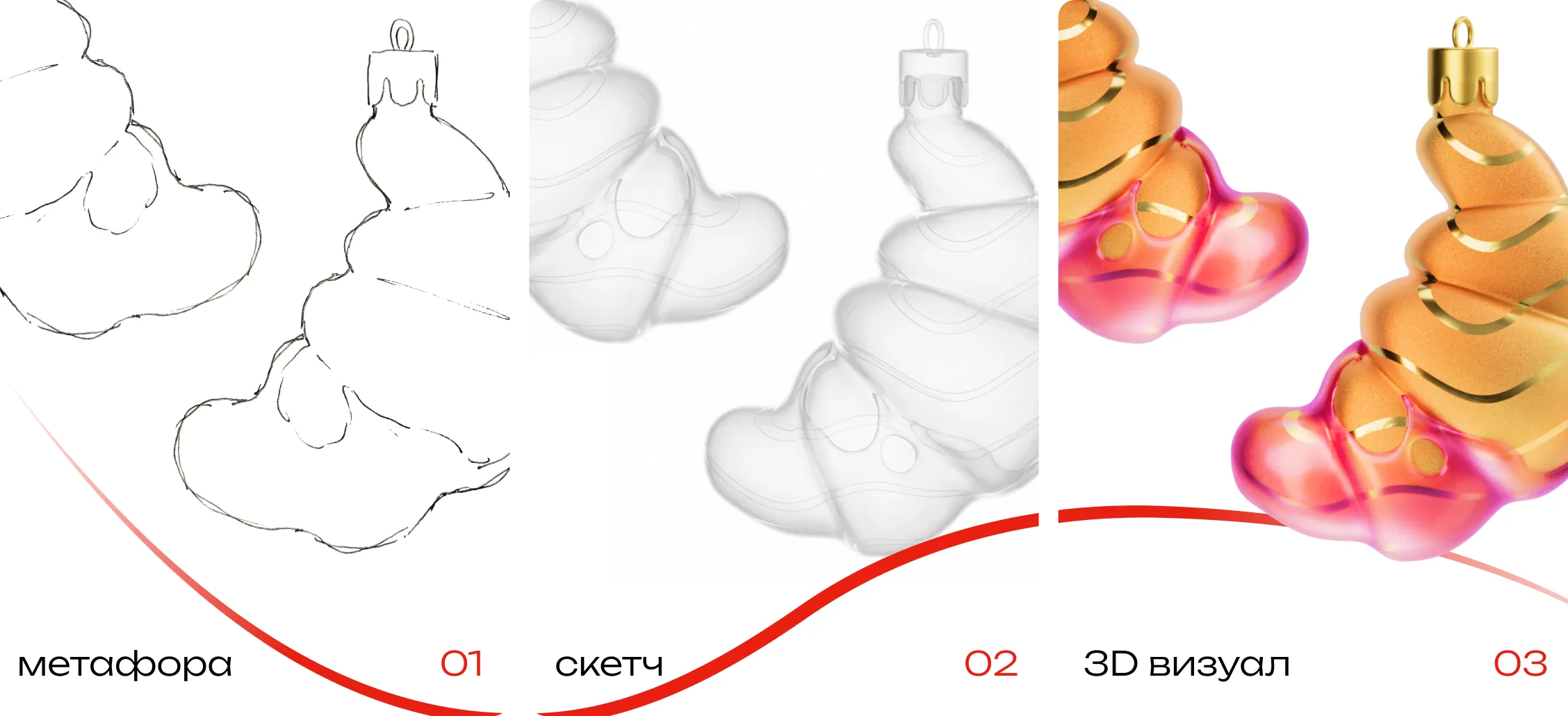 Разработка цифровых ёлочных игрушек мало отличалась от работы реального цеха. У нас было 3 линии производства. На первой мы собирали метафоры и относили их на согласование команде Альфа-Банка. Одобренные метафоры отправлялись на вторую линию, где становились 2D-скетчами, после чего также проходили контроль качества от нашего клиента. Только утверждённые эскизы попадали в работу к 3D-художникам, которые отрисовывали уже итоговые варианты — яркие, сочные, практически осязаемые.
