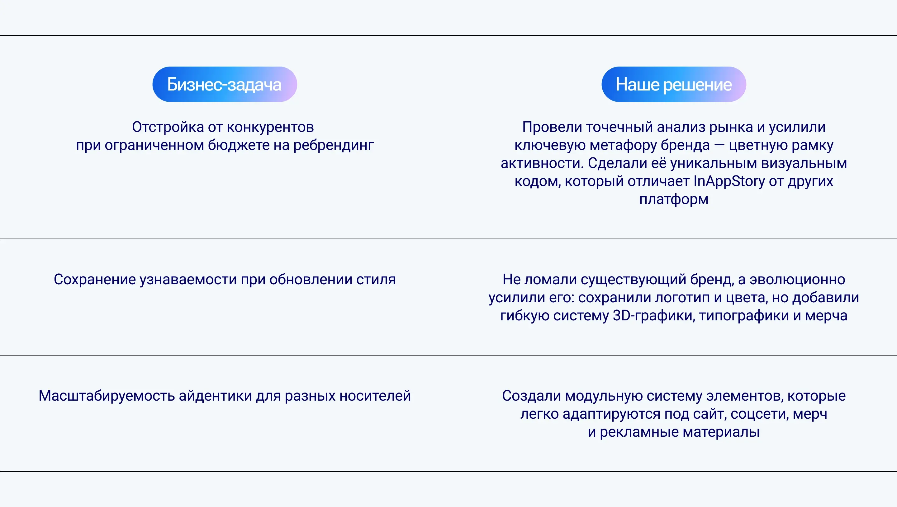 Платформа InAppStory попросила команду «Сияния» создать комплексную айдентику. Нам нужно было разработать бренд-систему, которая позволит компании масштабироваться без потери узнаваемости.
